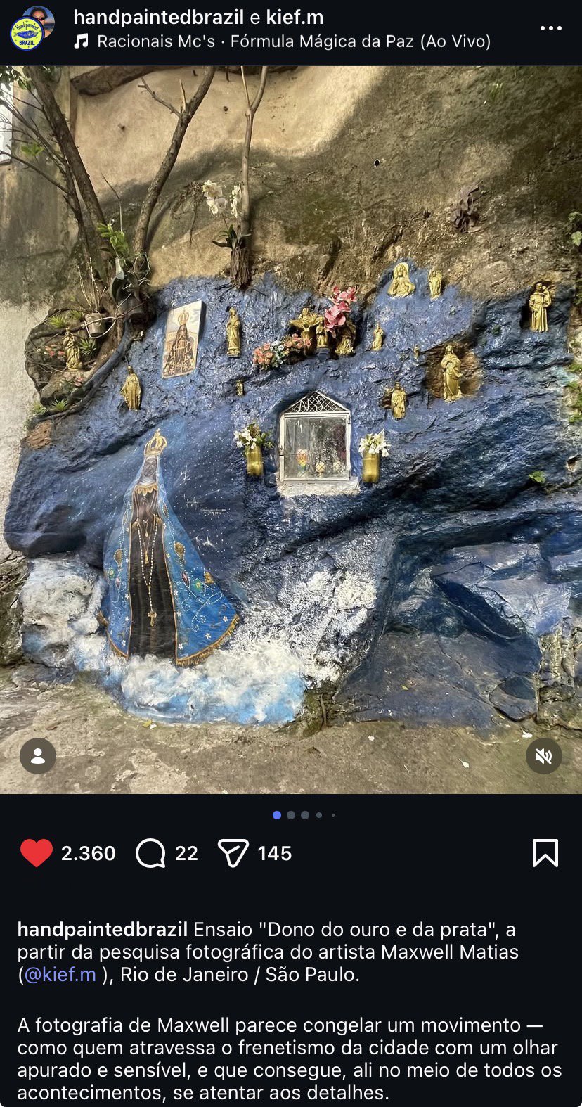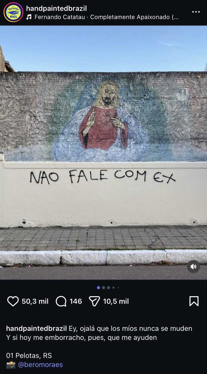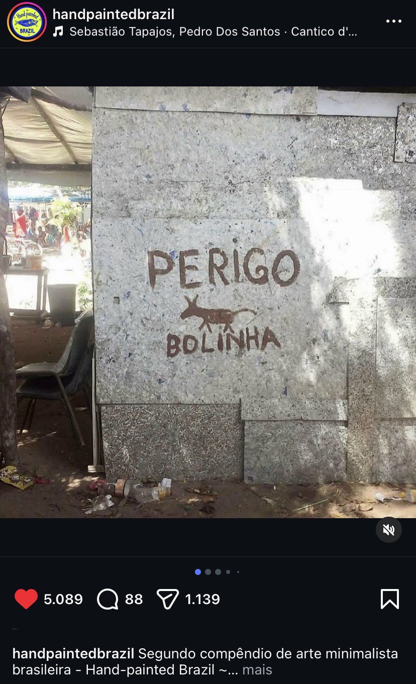 Since 2018, a research and curatorial project (instagram.com/handpaintedbrazil), which maps and researches Brazilian vernacular paintings. The project has over 135k followers on Instagram and 40k on X. It also holds a collection of more than 5,000 photographs of Brazilian paintings from all regions of the country.